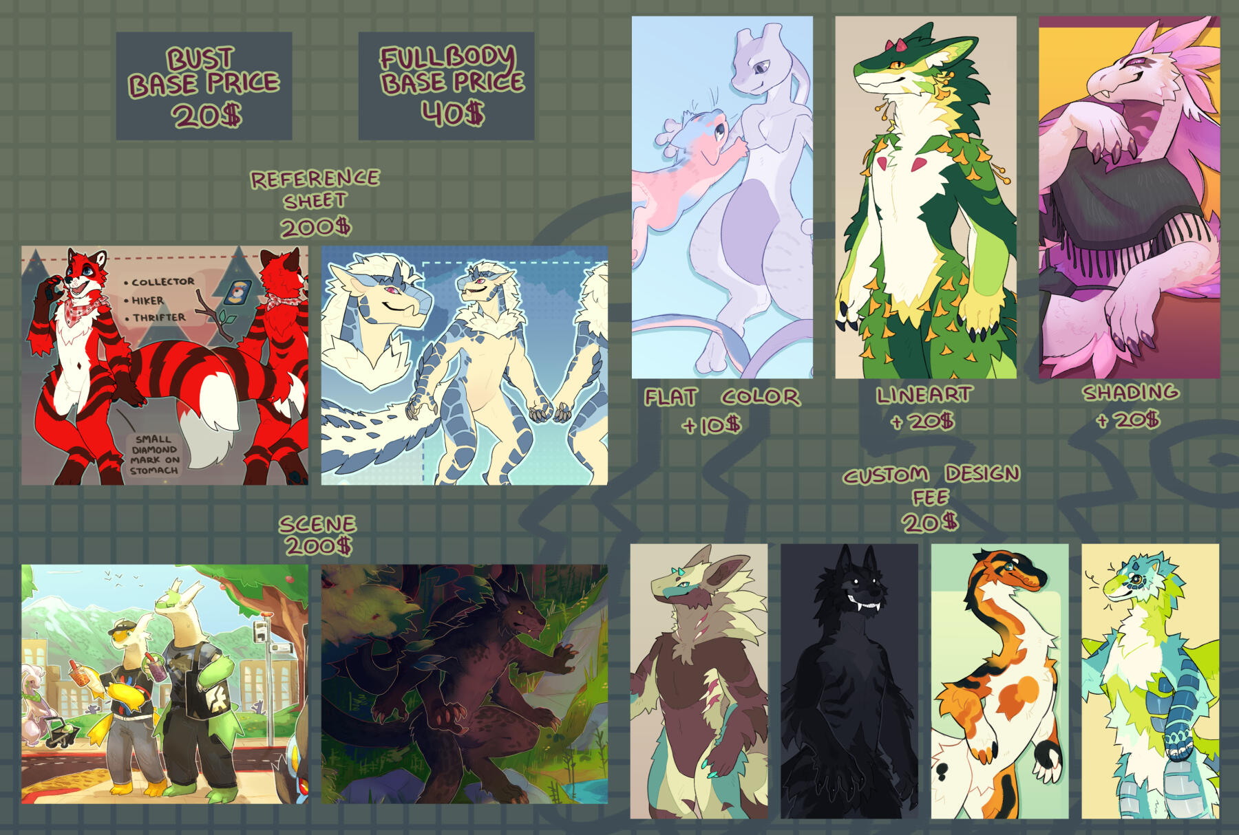 Commission prices are structured on a base, non colored sketch1. You can choose between any combination of, all, or none of the given additions. The price is added onto the base price. Absolutely feel free to ask me any questions on price, or clarification on your idea!1 A base sketch includes monochrome colored lines, rough marking/coloration outlines, and a flat or gradient background.Below are examples and information for a few commission types!